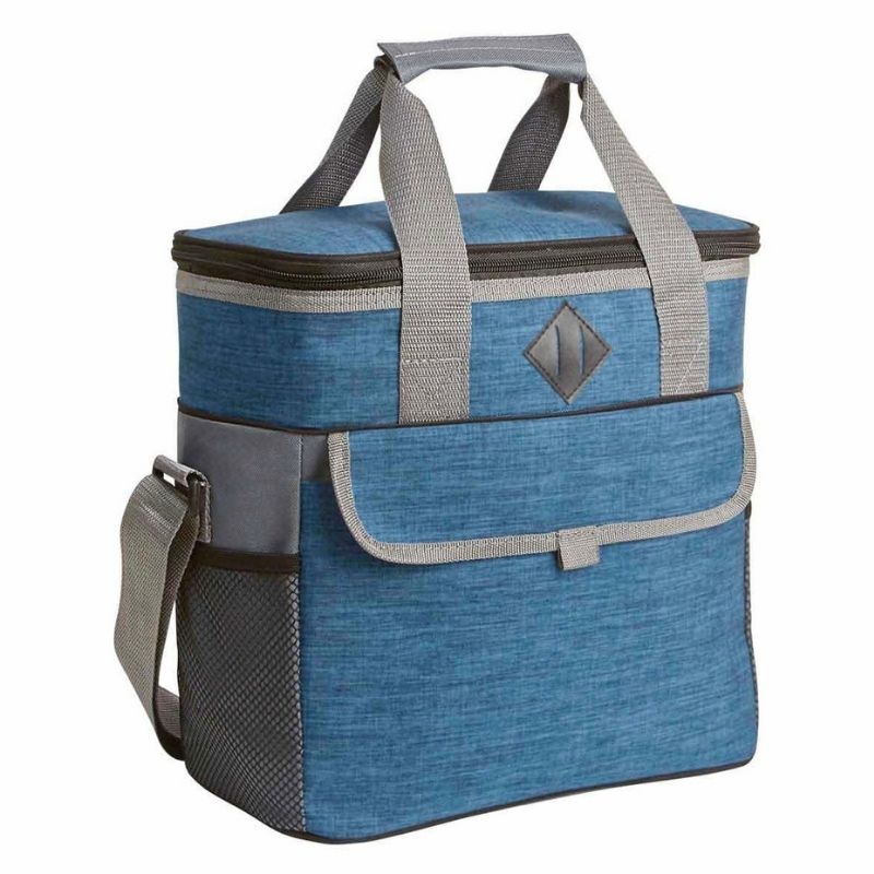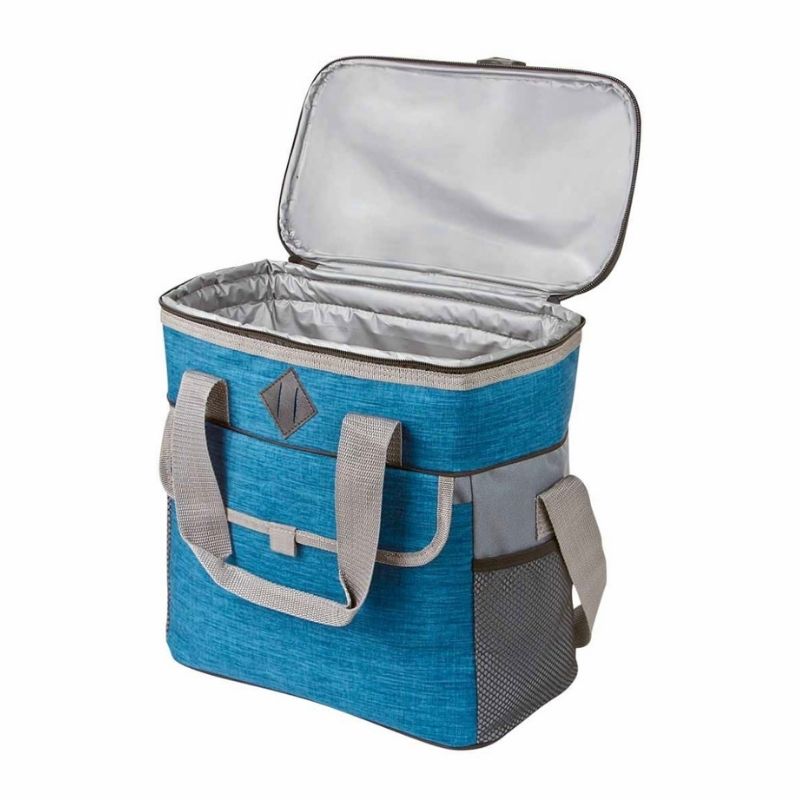 Hielera con interior en forro sellado, bolsa principal con cierre, bolsa frontal con velcro 2 bolsas laterales con malla y 2 asas superiores para agarre capacidad 12 latas.